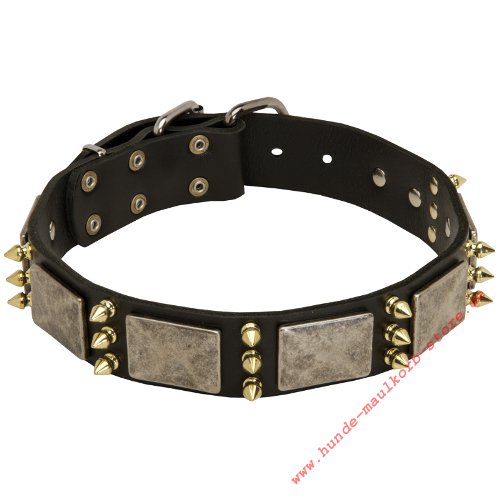 Dieses Lederhalsband ist mit symmetrischen proportionalen vernickelten Platten und Messingnieten vom Vintage-Stil gemacht. Sie können es in schwarz, braun und beige Farben bestellen. Das Halsband ist von sehr starkem, reißfestem echtem Leder angefertigt. Keine verdoppelte Füllstoffe oder mechanische Nähte, und das bedeutet, dass die Ränder nicht ausfransen. Jede Platte wird mit zwei Messingnieten handgesetzt. So handgesetzte Messingnieten sichern die vernickelte Stahlschnalle und D-Ring (für spezielle Anghängsel und Leine). Die Dekorationen sowie die Beschläge dieses Halsbandes sind zum Rost widerstandsfähig und daher werden sie Ihr Auge für eine lange Zeit freuen.